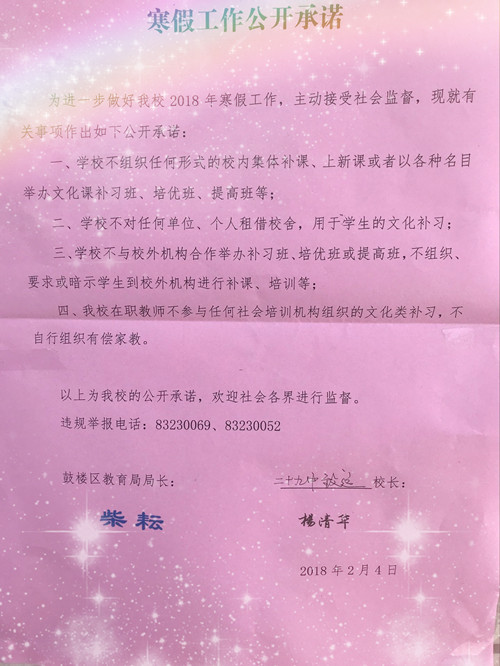 在会议的最后,杨校长代表学校领导班子,对全体教职工的师德师风问题、安全问题提出了严格的要求,再次强调了教师行为规范,特别在大会上宣读了我校寒假工作的对外承诺,承诺包含严禁致远教师参与任何形式的有偿家教等内容。会后,学校在大门口显著位置张贴了《寒假工作公开承诺》,接受社会监督。
