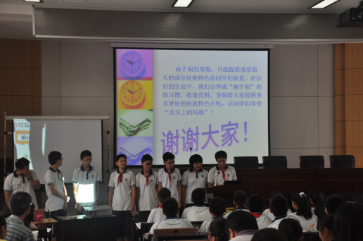 金秋时节,凉风习习,9月22日上午南京二十九中致远校区报告厅迎来了南京市全体初中地理教师。我校王凯老师为全市初中地理教师开设了一节研究课《民族》,王老师巧妙设计,引领学生“寻找身边的民族”,通过“我校师生民族调查”、“邮票中的民族”、“人民币上的民族”、“南京街头的民族元素”和“多民族灿烂的文化”五个主题活动,充分调动了每一个学生的积极性。王老师精心的指导,学生精彩的展示,赢得了现场老师阵阵掌声。南京市地理学科带头人张静老师现场点评,对王凯老师的这节课给与了高度的评价,认为这是一节 “构建了开放地理课堂的课”、“学生活动设计具有开放性和趣味性的课”、“课堂生活化,生活课堂化”以及 “展示王凯老师亲和力和个人‘味道’的课”。