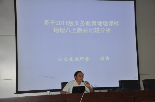 紧接着,六合教研室地理教研员厉兵老师给全体初中地理教师开设了题为《基于2011版义务教育地理课标地理八上教材的比较分析 》的讲座,厉兵老师理论联系实际,从“2001版课标的实施及十年的课改实验”、“中国国情的变化”、“2011版课标的实施”等三个方面,介绍了初中地理教材的变化及教师的教学策略的转变。让全体一线地理教师在理论学习的基础上能更好地开展教学实践。