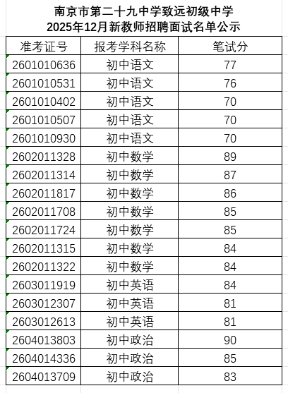 南京市第二十九中学致远初级中学2025年12月新教师招聘面试名单公示